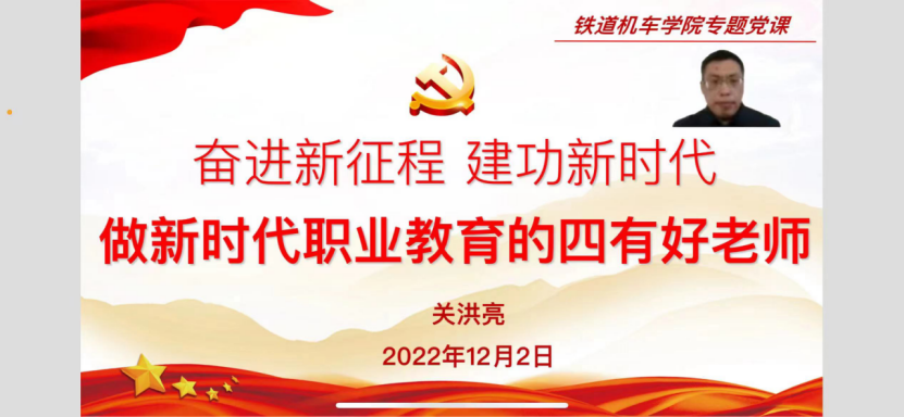 为深入学习贯彻党的二十大精神,激励教师全面落实立德树人根本任务,铁道机车学院于12月2日线上开展了“奋进新征程·建功新时代,做新时代职业教育的四有好老师”专题党课,铁道机车学院全体党员教师参加学习。