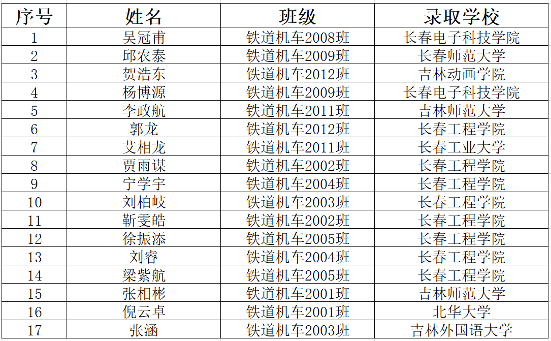 经过师生共同努力,学院在2023年度共有17名同学专升本升学成功,分别考入:北华大学1人、长春师范大学1人、吉林师范大学2人、长春工业大学1人、长春工程学院8人、吉林外国语大学1人、长春电子科技学院2人、吉林动画学院8人。